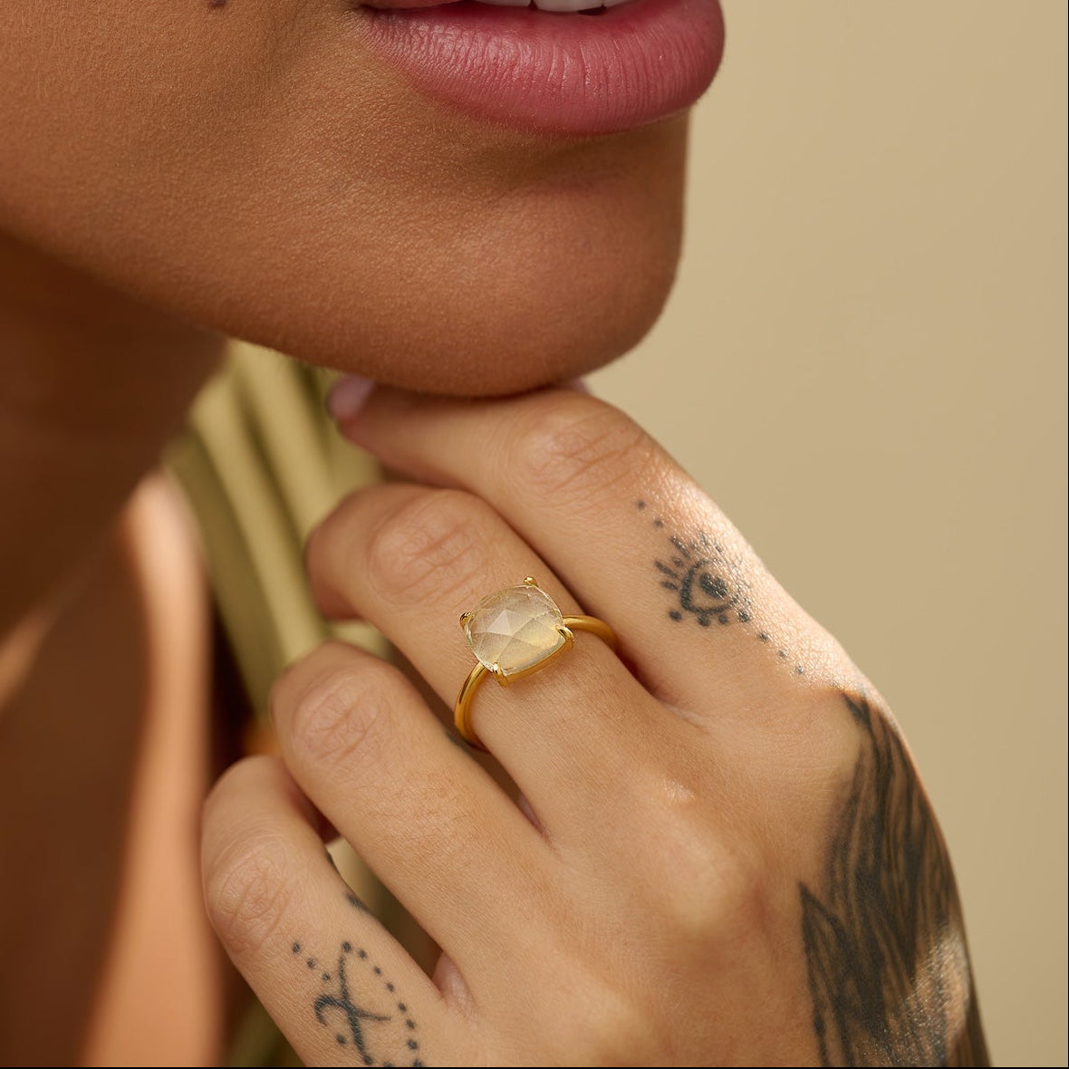 The Fluorite Ring is solid 925 sterling silver with a thick gold vermeil coating. It is adjustable and can be made bigger or smaller to fit all our awakened souls...